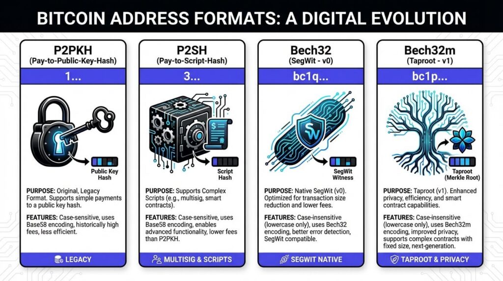 Bech32m (Taproot)—Starts with “bc1p”; adds more privacy and script flexibility.